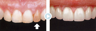 | 神経を抜いたため変色した前歯。ホワイトニングでも効果は得られませんでした。しかし、オールセラミックの薄い歯を貼り付け、審美的に調和のとれた美しさが得られました。 | ![]() |